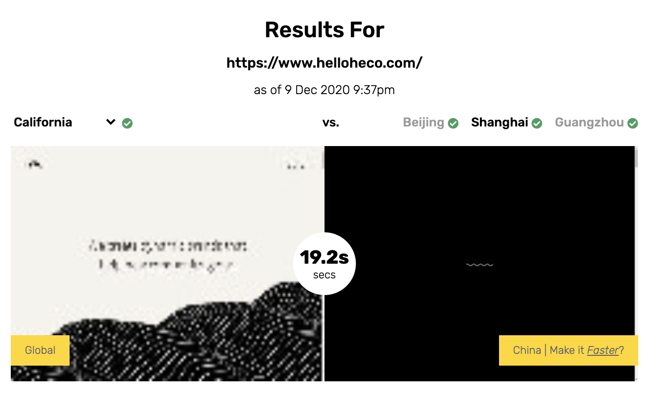 Key performance metrics of helloheco.com loaded in California vs China.