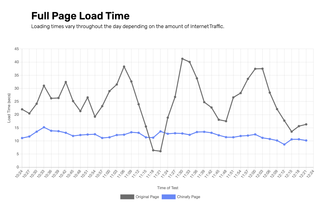Gray URL (Original site) vs. Blue URL (After Chinafy), with full-page load time values over a 2-hour period of time