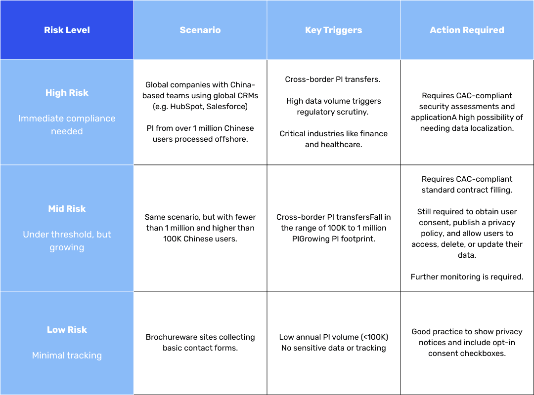 Data localization: Do you handle the personal information of over 1 million individuals from China? That volume is likely to raise flags with Chinese regulators, and trigger requirements to store and process that data within Mainland China.