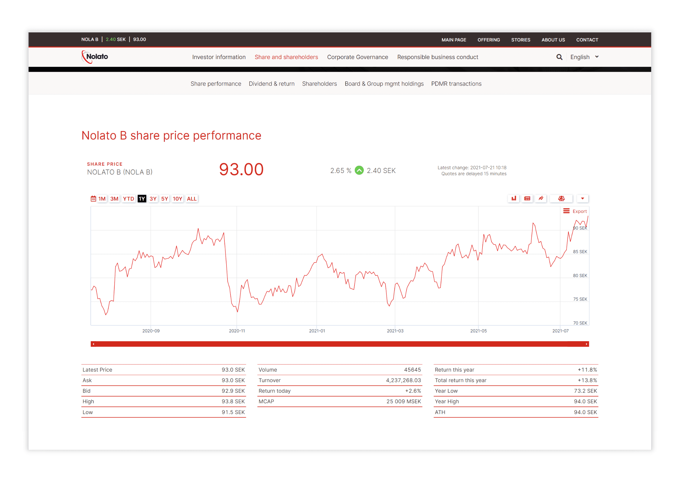 A performant investor relations component that relays Nolato’s stock information on the Nasdaq Stockholm friction-free