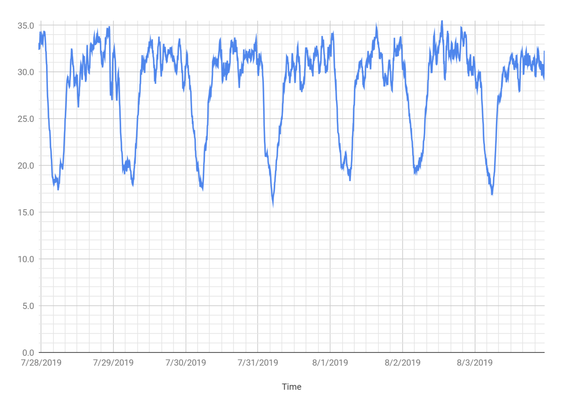 Over the 7 days, we see clear cyclicality linked to the time of day. Sites are fastest at night loading in about 17-18 secs when internet bandwidth demands are low, and slowest basically at most times throughout the day (the dates in the graph below align with the beginning of the day, or ‘midnight’) loading in about 33-34 secs.