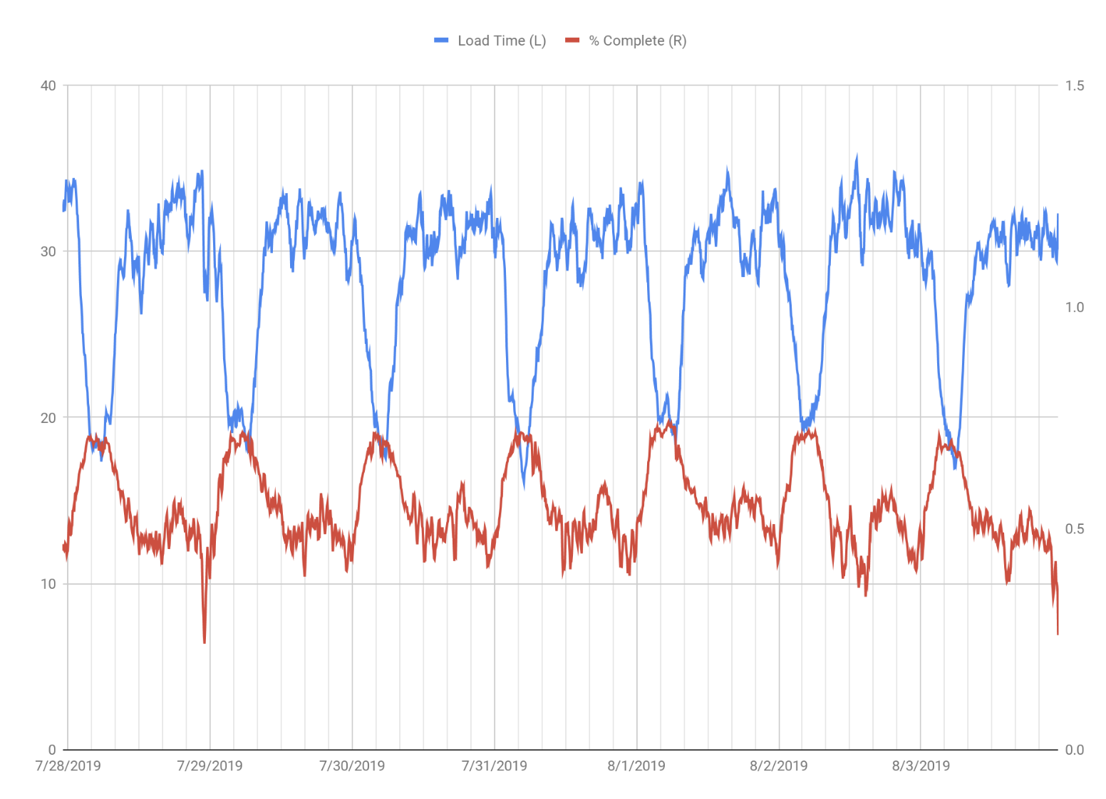You can see 7 clear times when the pages were loading more fully - in the 70% context. These however, are unsurprisingly at 3-4am in the morning when few are awake and internet demands are limited. Given the cyclical nature of both Loading Time and % Page Complete, we propose a few questions: