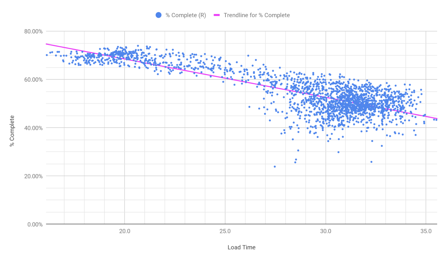 When we compare % Loading Time vs % Page Complete across the 10 sites taking individual data points, and not averages, we see an opposite relationship to what we saw on a macro basis. We see a positive 47% correlation, and a 24% significance indicating loosely that: