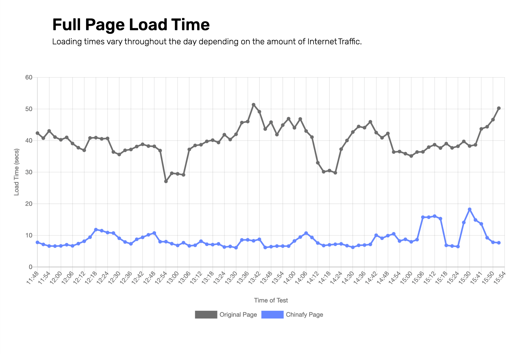 Comparing the original website against the Chinafy version in Beijing, the average Page Complete time is as follows: