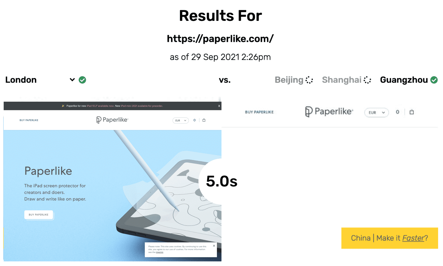 Traditionally if a website were to load fast and fully in China, they would need to be hosted in China (requiring both a China business entity, ICP license, onshore support, CDN agreements etc.) and have been localised, built, and managed differently to their global site. This process takes anywhere from 3 weeks to 2 years, not to mention multiple headcount.