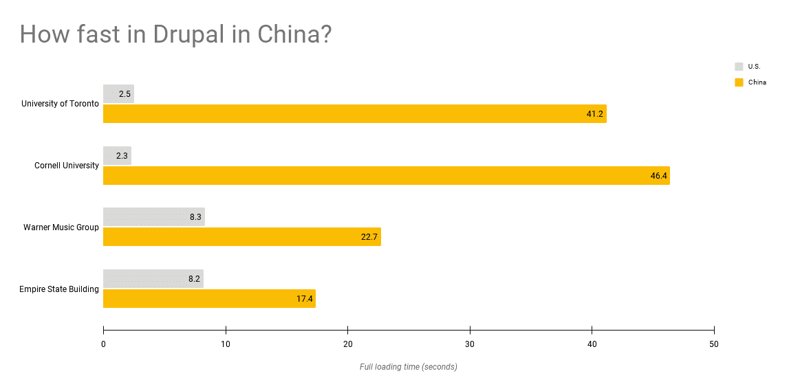 When accessed from China, Drupal websites are on average 6x slower than they are globally, with an average packet loss of 47%.