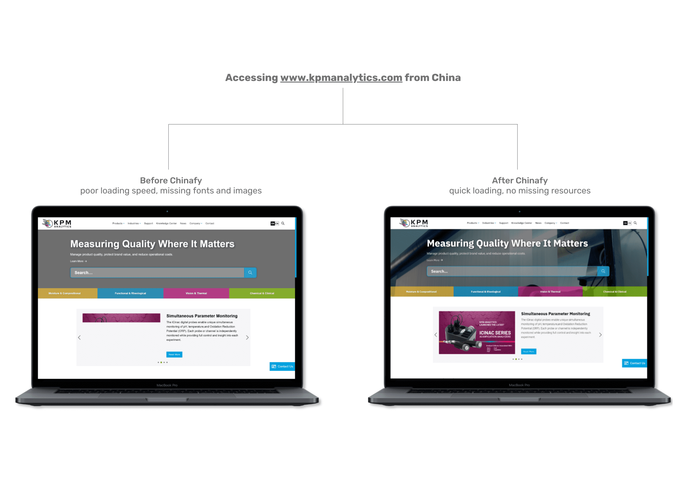 As with most sites, the technologies used on the KPM Analytics website worked perfectly for non-China audience, but nonetheless encountered challenges delivering in China. Across the website some resources that were -