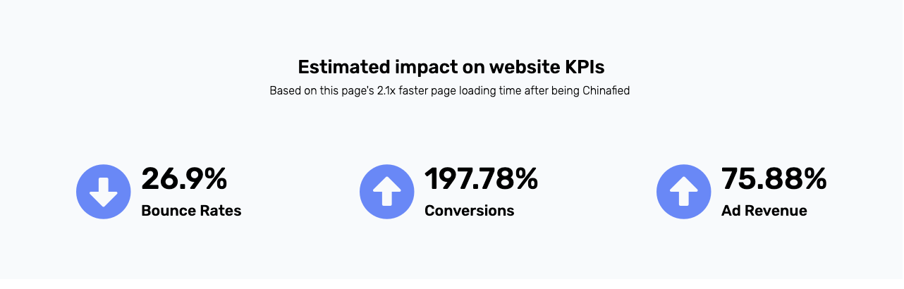 After Chinafy: The website would fully load (including trailing items like trackers) in about 10s in China. The site would visually load in less than half that time.