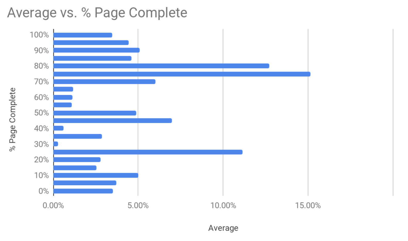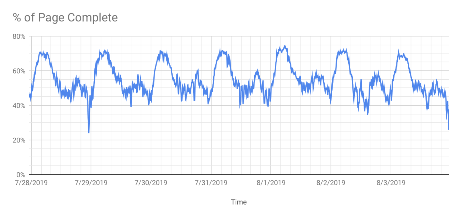 From this, we can see that pages load to about the 55% mark on average, and frequently see less than 50% of the page displaying (this is already after 30 seconds mind you!)