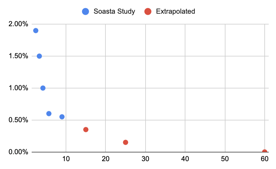 Bing is fast to begin with, so it's dangerous to extrapolate out too far in the sense that the area of significance probably changes dramatically beyond 5 seconds. In any event, we take this metric and extrapolate it linearly. So a site that loads 10 seconds slower would have 5 x 4.30% = 23.50% less revenue. We take this one step further, however.