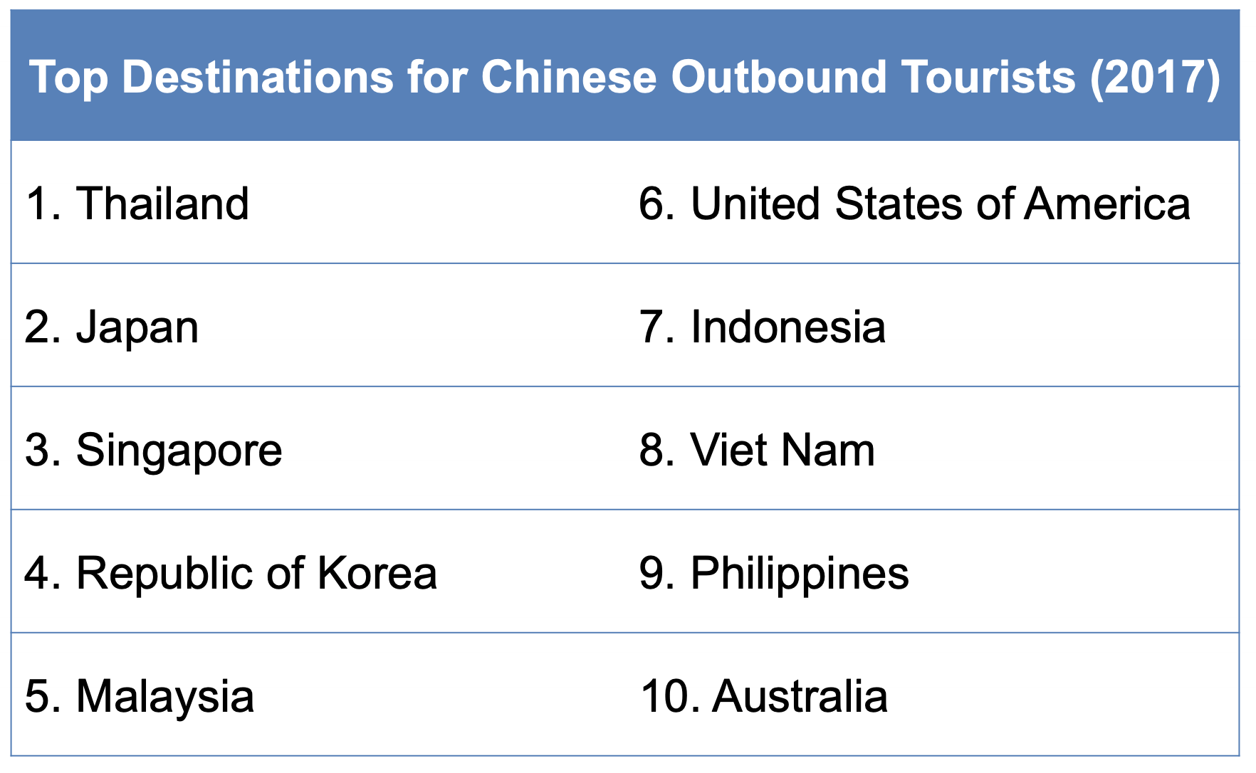 China has been the top spender in International Tourism since 2012, with 21% of global tourism receipts as of 2017 with the top destinations being: