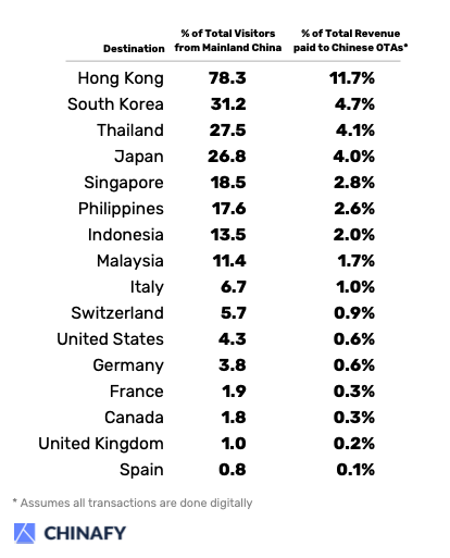 In Singapore, where the question first came up of "How much top-line revenue is paid to OTAs?", a whopping 20% of travellers are from China, representing the single-largest geographic segment. In Japan, where this conversation continued, it's almost 27%, with South Korea taking the top spot at 31.2%. If we take these % China Traffic and multiply it by the 15% commission, we end up with the % of Total Revenue paid to Chinese OTAs below.