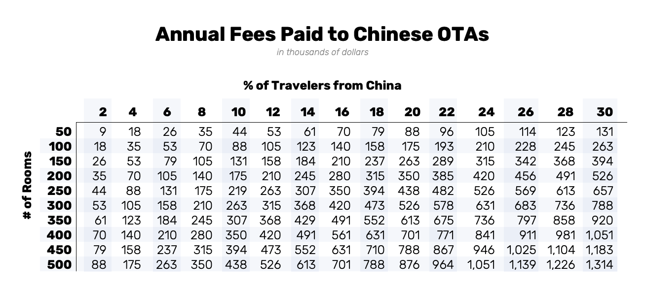 The table assumes an 80% Occupancy, $200 per night, and 15% fee to the OTAs. Simply look up the # of Rooms, and the % of visitors from China to calculate the rough annual cost. If your average stay is $100 per night, simply divide the numbers below by 2.