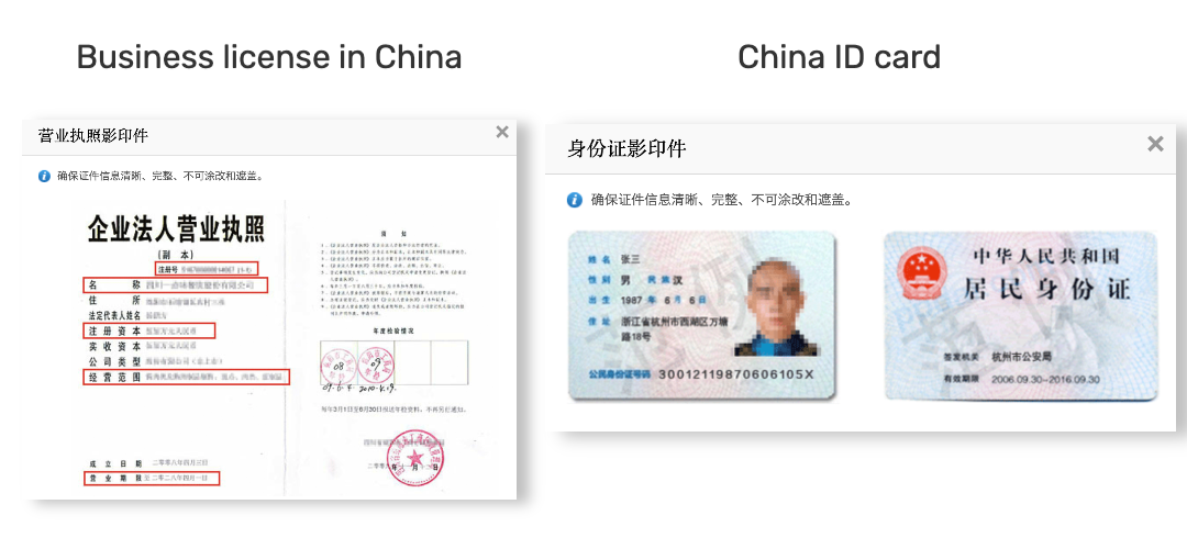 2. Verify account with a business license number, a business bank account, ID card of a legal entity. See a preview below.