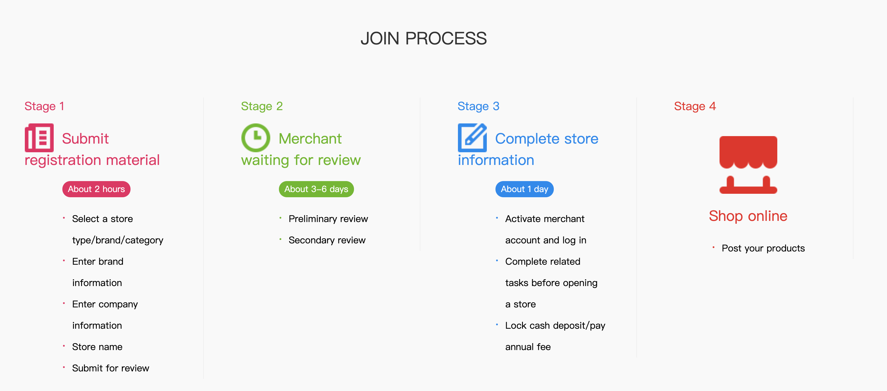Tmall outlines the application process into 4 stages.